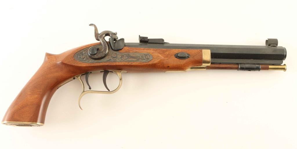 Quality American made single shot muzzle loading percussion target pistol chambered for .45 caliber ammunition. Features a blued 9" octagonal barrel, dovetailed shrouded post front sight, adjustable rear sight, double-set triggers, bass finger rest trigger guard, case hardened lock & hammer, wood ram rod with brass tip, and one-piece walnut stock with brass forend & grip caps. Pistol exhibits approximately 99% of it's original finish showing nice case colors and only minor handling marks. Action is crisp but will not fire without setting the trigger, the bore is excellent and the wood stock is fine. Condition is near NRA Perfect. ***Antique Firearm***