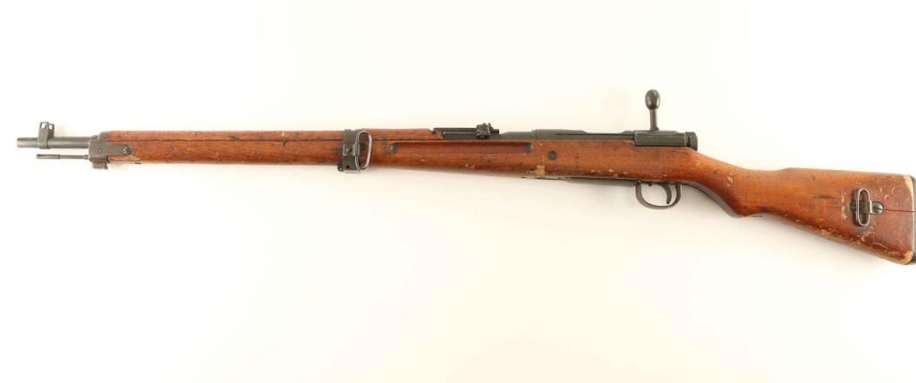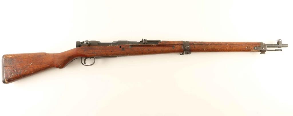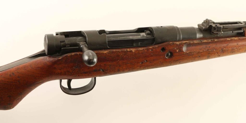 SN: 9662 WWII era Japanese military bolt action short rifle chambered in 7.7mm Japanese, manufactured circa 1942. Features a blued finish, 25.9" barrel, shrouded inverted 'v' front sight, flip-up ladder rear sight graduated to 1,500 meters with folding anti-aircraft leading arms, two barrel bands with bayonet lug on the forward band & monopod provision on the rear, cleaning rod, straight bolt handle, internal box magazine with hinged floorplate, smooth trigger, knurled cocking piece with safety knob, early receiver marking with defaced mum, sling swivels, smooth wood handguard and pistol grip shoulder stock with finger grooved handguard & smooth metal buttplate. Serial numbers match on the receiver and bolt handle with no other numbers observed. Rifle exhibits an aged brown patina showing minimal surface rust with some bluing retained in the protected areas. Action is sound, the bore is very good and the wood stocks are fair with scattered losses & the butt splitting. Condition is NRA Fair. ***C&R Firearm***