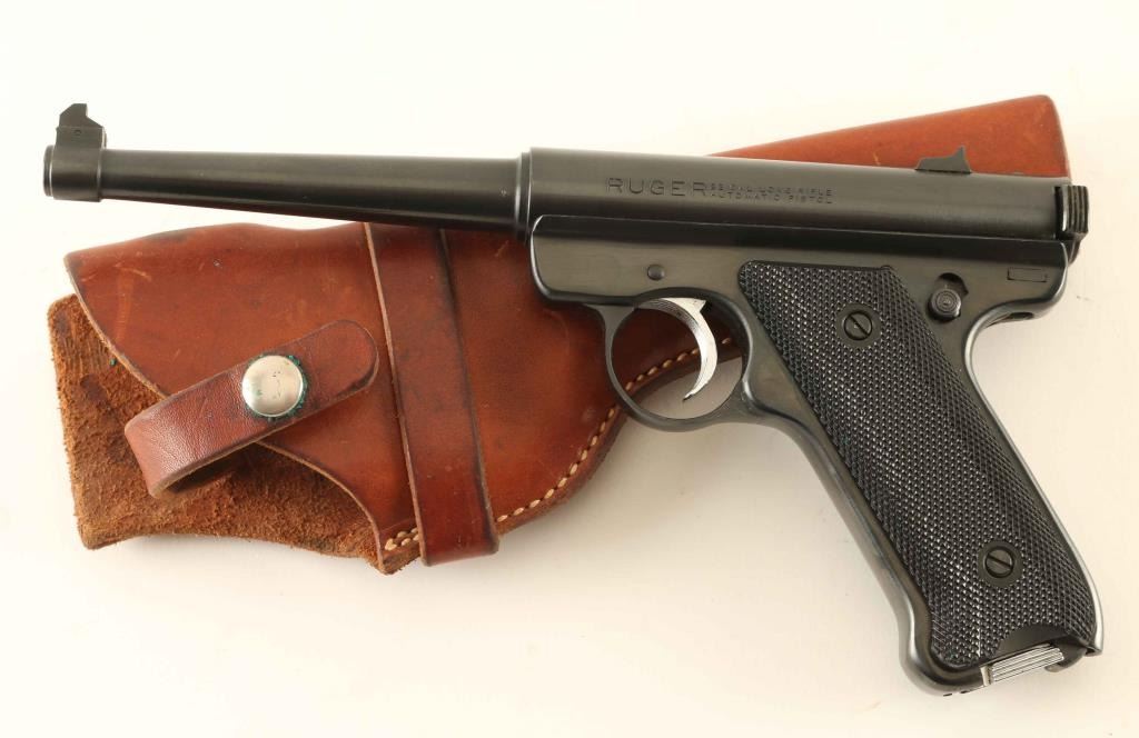 American made single action semi-automatic pistol chambered in .22 Long Rifle, manufactured circa 1974. Features a blued finish, 6" tapered barrel, pinned patridge front sight, dovetailed rear sight with square notch, serrated wide trigger, concealed hammer, manual safety/bolt catch on the left side of the frame, heel magazine release, factory 9 round magazine with chrome plated floorplate and two-piece checkered black plastic grips with black/silver Ruger medallion on the right panel. Includes a smooth brown leather belt loop holster. Pistol exhibits approximately 97% of it's original blued finish showing a few scratches and a small amount of light surface rust. Action is smooth, the bore is excellent and the plastic grips are fine. Condition is near NRA Very Good. ***Modern Firearm**