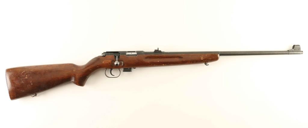 Romanian military magazine fed bolt action training rifle chambered in .22 Long Rifle, manufactured by International Mechanical of Cugar circa 1983. Imported by C.A.I, of St. Albans, V.T. with import marks on the barrel. Features a blued finish, 23.25" tapered barrel, ramped & hooded post front sight adjustable for elevation, dovetailed express rear sight with leaves for 25, 50 & 100 meters, integral scope rail cut into the receiver, turned down bolt handle, manual safety, smooth trigger, detachable 5 round magazine, sling swivels, and smooth wood pistol grip shoulder stock with finger groove forend & trapdoor metal buttplate. Serial numbers match on the receiver and barrel. Rifle exhibits approximately 90% of it's blued finish showing light wear and scattered handling marks. Action is sound, the bore is pristine, and the wood stock is good+ with small scattered blemishes. Condition is NRA Very Good. ***Modern Firearm***