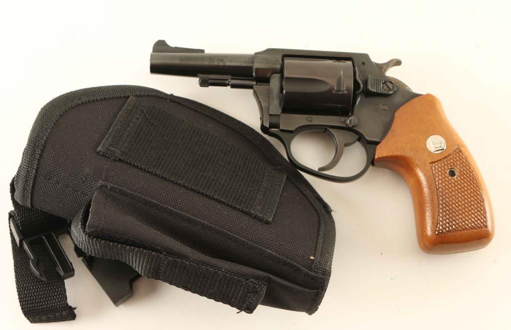 Revolver. 5-shot, double action. Small frame. 99% blued finish. case-hardened hammer. 3" tapered barrel. Checkered wood grips. Action is tight, and cylinder indexes properly. Bore , and cylinder chambers appear excellent, but dirty. Blued finish is excellent, except for some drag lines on the cylinder. Comes in a black nylon holster. NRA condition-Excellent. Modern Firearm.