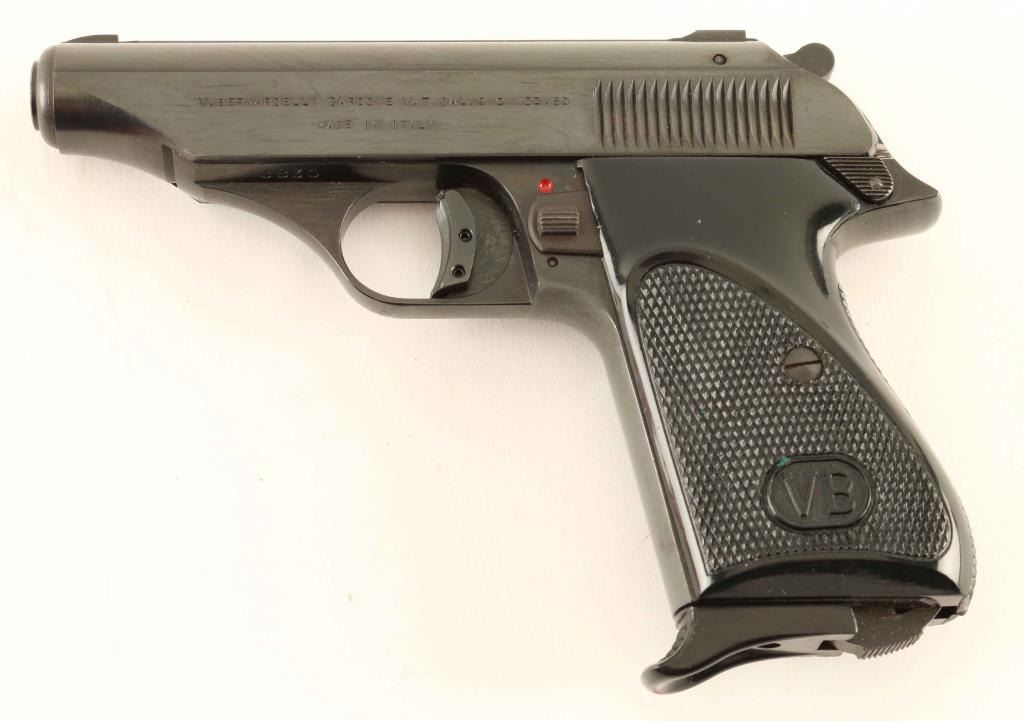 Semi-automatic pistol. 98% blued finish, with black plastic checkered grips . Bore appears excellent/bright, but slightly dirty. Action is tight. Extra wide, serrated trigger. Some minor scratches to the metal, and plastic grips, but overall a very nice conditioned pistol. Comes in the original red cardboard factory box. Box comes with information sheet in English, cleaning gear, and proof certificate in Italian dated 1959. NRA-Condition-very good. Modern Firearm.