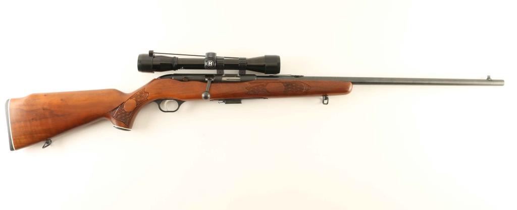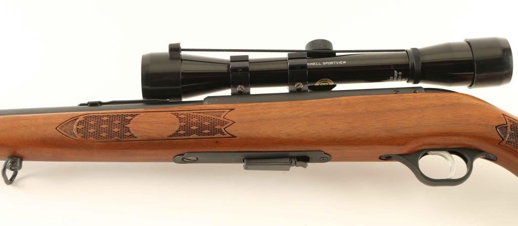 'Chuckster' Blued finish, 24" barrel, front sight, removed rear sight leaf, Bushnell Sportsview 4x scope, detachable magazine, thin serrated trigger, sling swivels and press checkered wood pistol grip shoulder stock with right handed cheek rest. Approx. 98% finish intact with some light handling marks/scuffs but no major wear. Working action, clear optics, bright bore and fine wood. NRA Excellent. ***Modern Firearm***