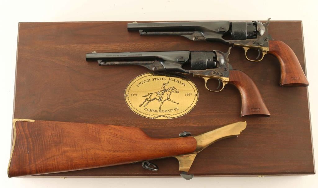SN: US2761/2761US Cased set of twin Colt 1860 Army .44 Caliber revolvers celebrating the 200th anniversary of the United States Cavalry. Manufactured circa 1977 with approximately 3,000 sets produced. Features two percussion revolvers in the following configuration: blued & case hardened finish, 8" round barrel, German silver front sight, 'v' notch rear sight cut into the hammer, 6-shot cylinder with roll stamped naval engagement scene, smooth thin trigger, brass trigger guard, knurled hammer spur, one-piece walnut grip with boxed "MJK" cartouche and provisions for a shoulder stock. Includes a walnut presentation case with a blue velvet lined compartmentalized interior with shoulder stock #US2761, cap tin, powder flask, bullet mold, and combination tool. Revolvers exhibits approximately 99% of their original finish showing a few minor losses with no major wear. Actions are crisp, the bores are excellent and the walnut grips are fine. Condition is NRA Excellent in case. ***Antique Firearms***