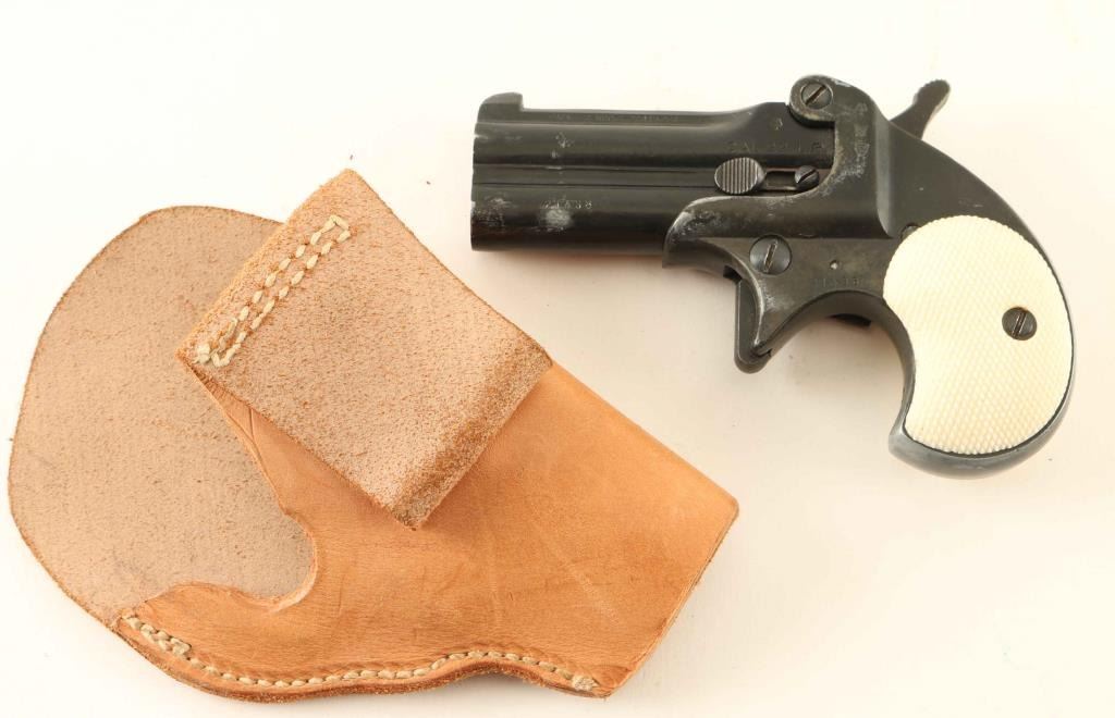 Deringer. Two-barreled, tip-up pistol. 60% matte-black, painted finish. White checkered plastic grips. 3" Barrel bores appear dirty, some rust spots. Action is tight, and barrels lock up tight. Finish is scuffed up, with about 60% remaining. Comes with a brown leather belt holster. NRA condition-Good. Modern firearm.