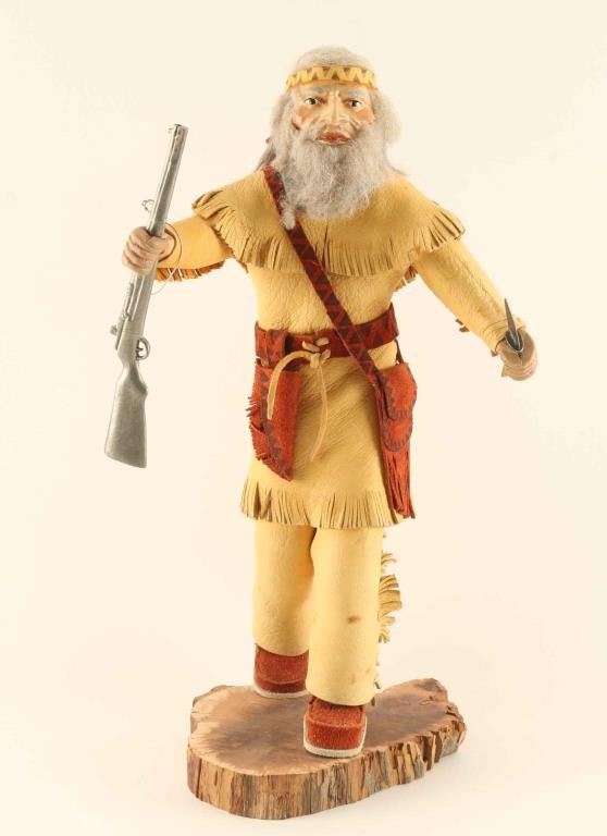 Buckskin leather clothes, rabbit fur accents on wood base.