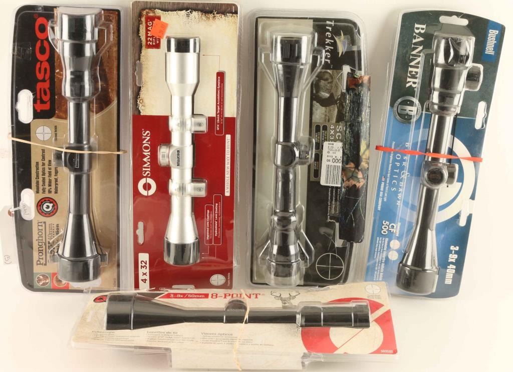 Including; Bushnell Banner 3-9x40mm with Dusk & Dawn optics, Trekker 4x32mm, Simmons 3-9x 8-Point, Tasco Pronghorn3-9x40mm, and a Simmons 4x32 22Mag rifle scope.
