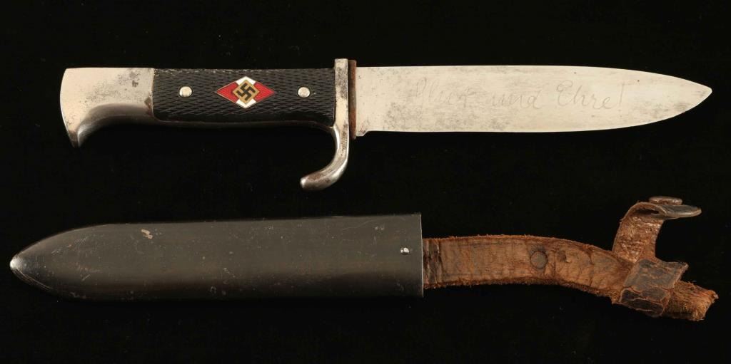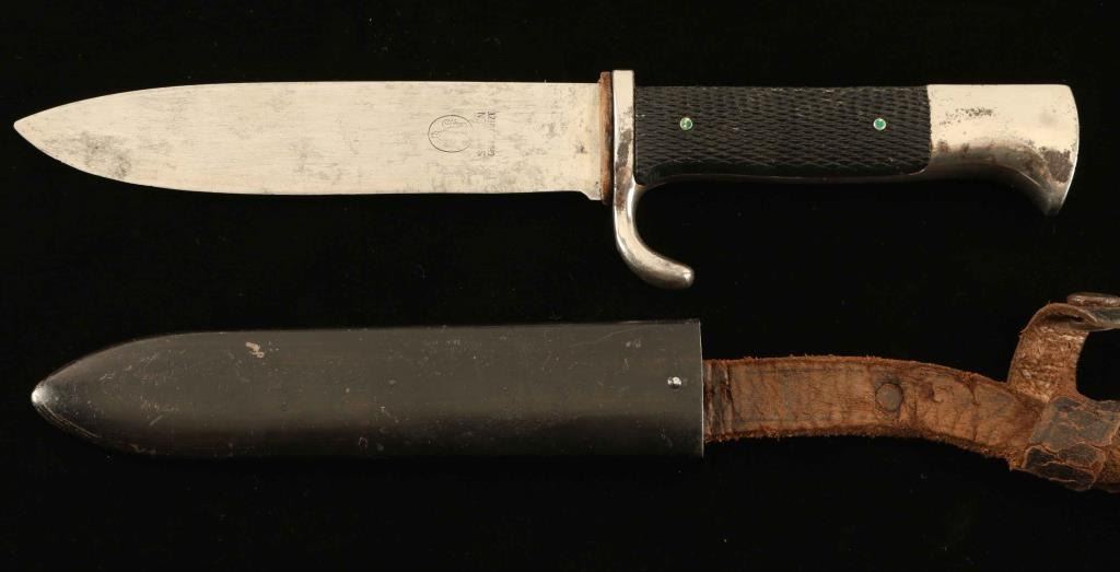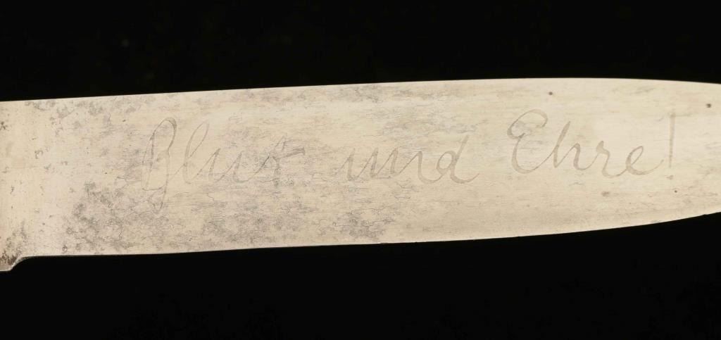 Blade is marked with squirrel in a circle, clear moto on blade, lightly sharpened, loop on scabbard broken.