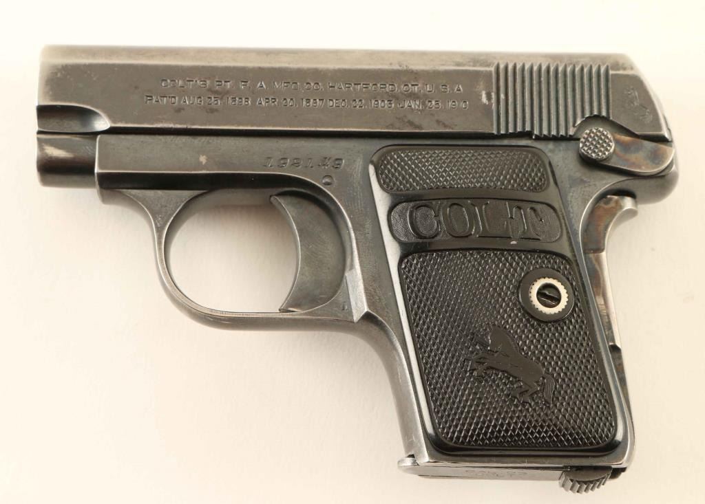Vintage striker fired semi-automatic pocket pistol chambered in .25 Auto, manufactured circa 1918. Features a blued finish, 2" barrel, fixed sights, smooth trigger, case hardened manual safety/slide catch on the left side of the frame, case hardened grip safety, magazine disconnect safety, heel magazine release, factory 6 round two-tone magazine, steel frame and two-piece checkered black hard rubber grips with "COLT' and Rampant Colt decor. Pistol exhibits approximately 60% of it's original finish with a heavy amount of carry wear, a small amount of light pin prick pitting and nice case colors. Action is smooth, the bore shows pin prick pitting throughout, markings are crisp and the hard rubber grips are very good. Condition is NRA Good to Very Good. ***C&R Firearm***