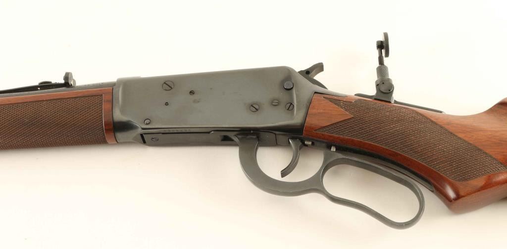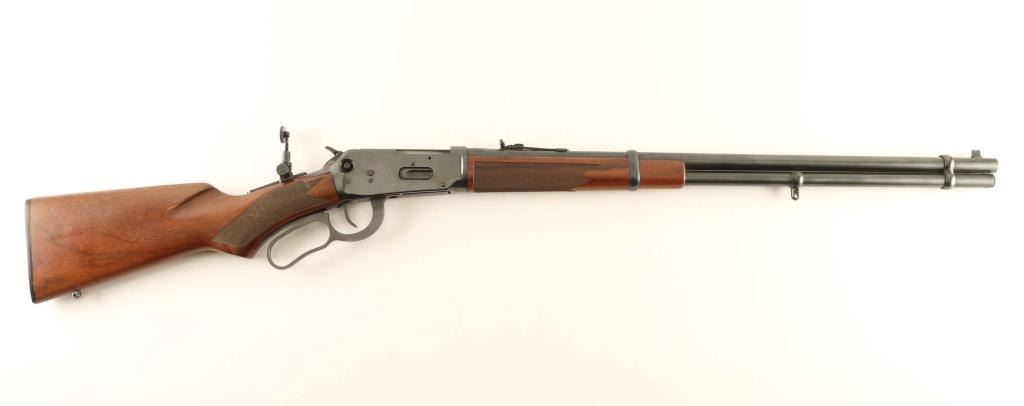 Rifle, lever-action. 97% blued finish. Checkered, pistol-grip stock, and forearm. Black plastic buttplate. Sling swivel studs added. Marbles peep sight has been added on the tang. 24" barrel. Bore appears very good, but a bit dusty. Action is smooth/tight. Some minor scratches to the metal. Also some scratches/dings to the wood, but overall, a nice conditioned rifle. NRA Condition-Very good. Modern firearm.
