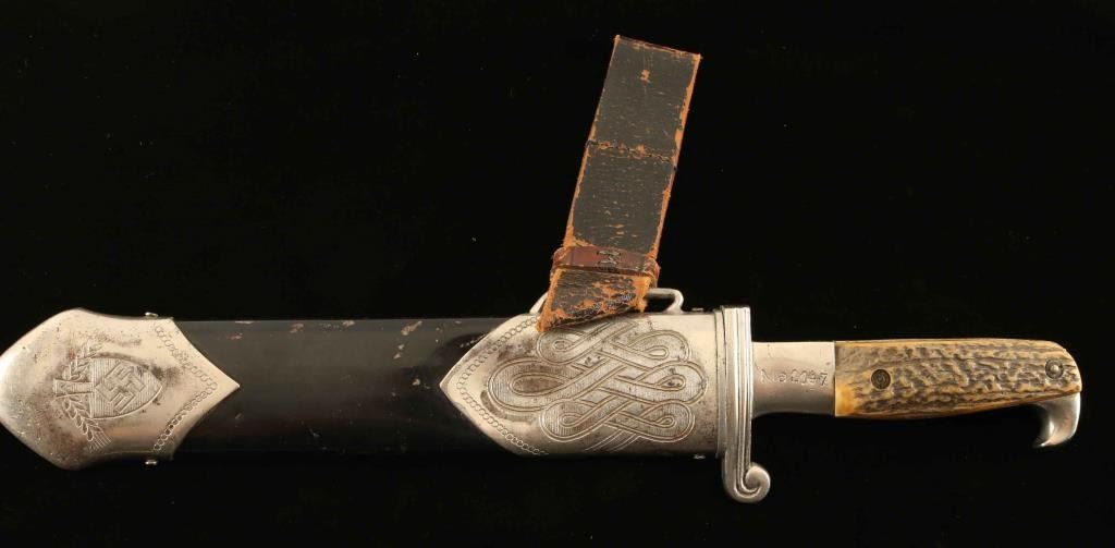 Enlisted mans Hewer, marker marked Crebs, with original black leather hanger, stag grips have been replaced, dent in scabbard, NO stamped on handle. Overall good.