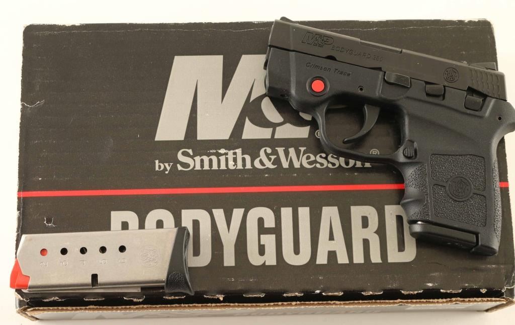 The M&P BODYGUARD 380 retains original design features including a 2 ¾-inch barrel, which contributes to an overall length of 5 ¼ inches and an unloaded weight of only 12.3 ounces making it perfectly suited for concealed carry. Features a built in crimson trace laser, Stainless Steel Drift Adjustable Sights, Two Magazines Included (Finger Groove and Flat Butt Plate), Ergonomic Grip, High-Strength Polymer Frame, External Takedown Lever & Slide Stop, Manual Thumb Safety, Double Action Fire Control, Stainless Steel Barrel & Slide ,Adjust Laser Without Any Disassembly of Firearm. Includes box, 2 mags, and soft case. NRA Excellent Modern Firearm