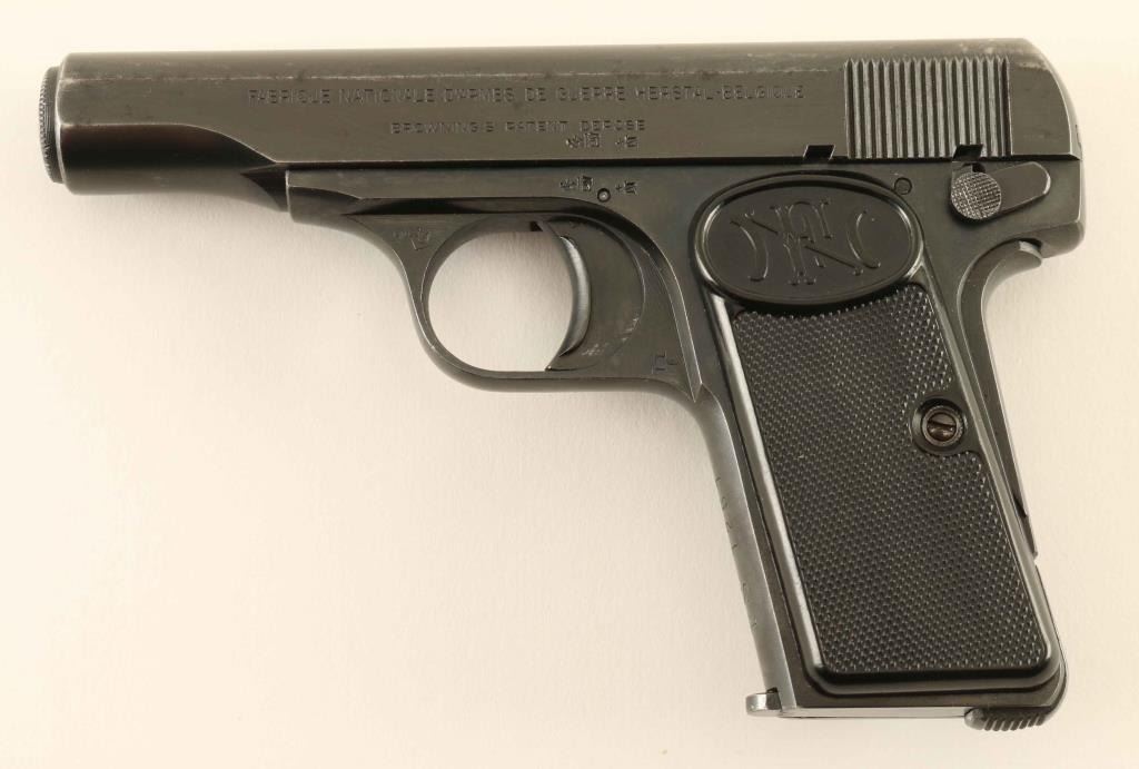 Sachsen police school marked striker fired semi-automatic pocket pistol chambered in .32 Auto, manufactured in Belgium post WWII. Features a blued finish, 3.4" barrel, fixed sights, rounded trigger, manual safety/slide catch on the left side of the frame, grip safety, magazine disconnect safety, heel magazine release, factory 7 round magazine, steel frame and two-piece checkered black plastic grips with FN monogram on the tops. The trigger guard is stamped "SILESIA" and the front strap is stamped "PS 1261" for the Sachsen police school with a 1261 property number. All observed serial numbers are matching. Pistol exhibits approximately 90% of it's original finish showing some high point edge wear, light scattered pin prick pitting and some finish loss on the front strap & grip safety. Action is sound, the bore is pristine and the plastic grips are fine. Condition is near NRA Very Good. ***C&R Firearm***