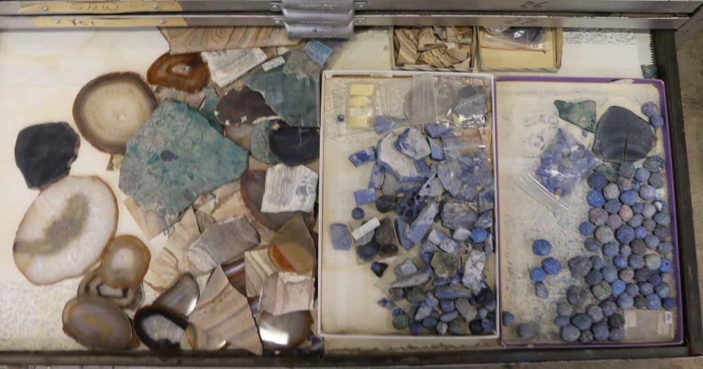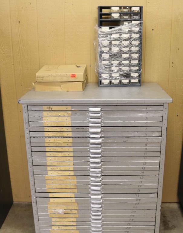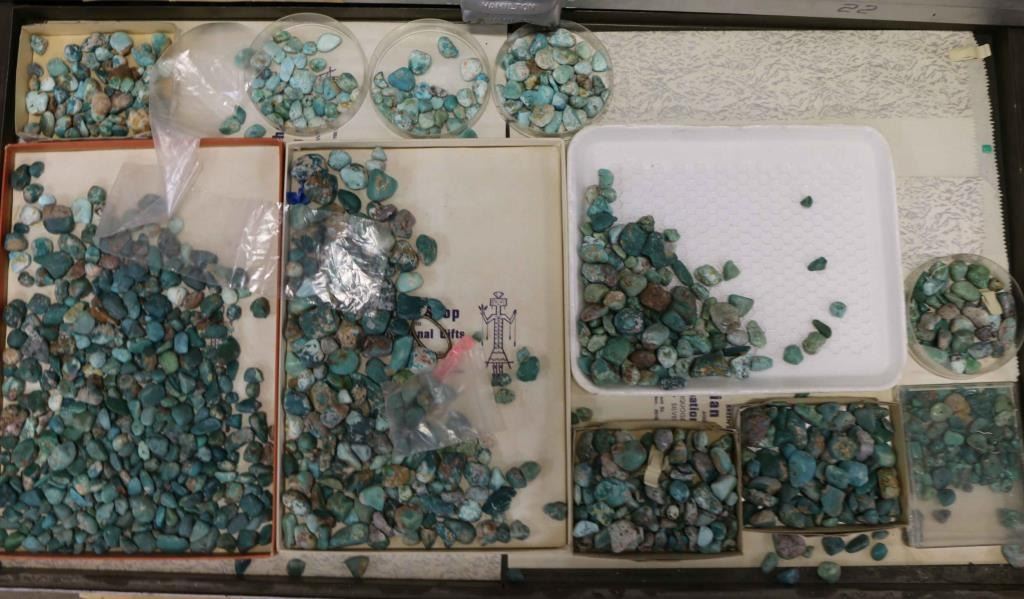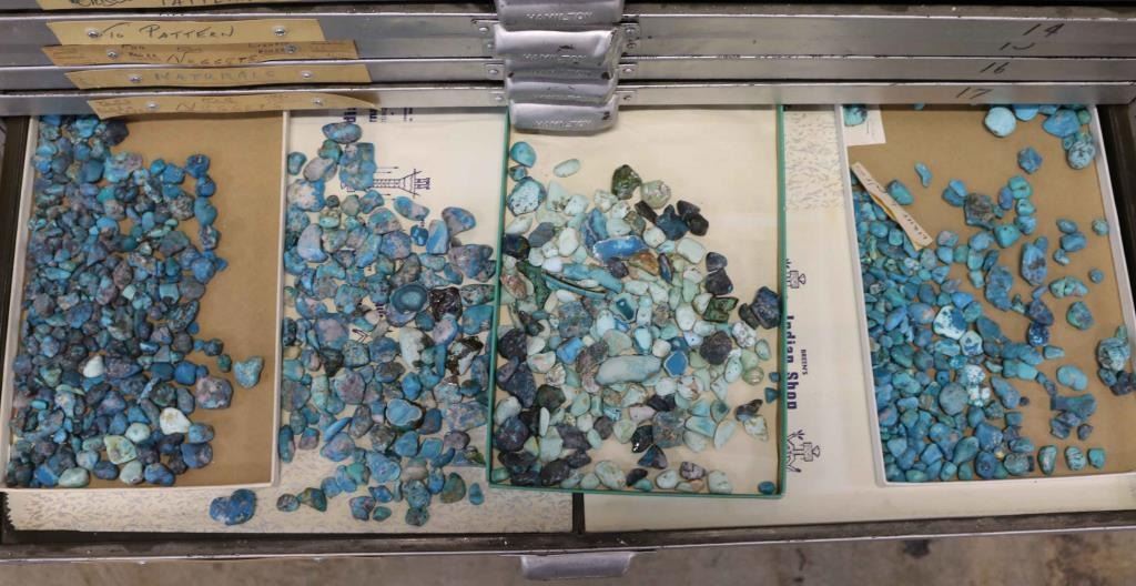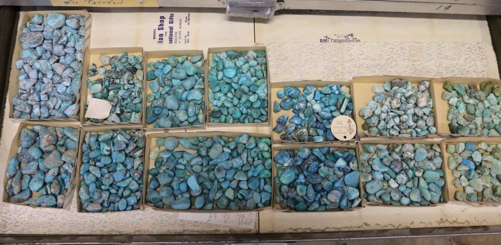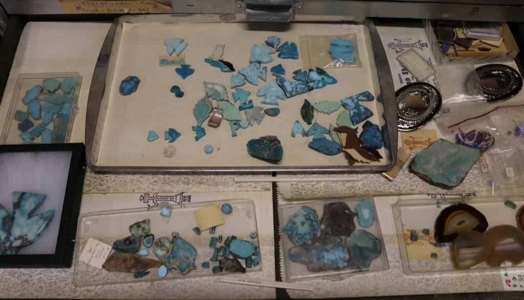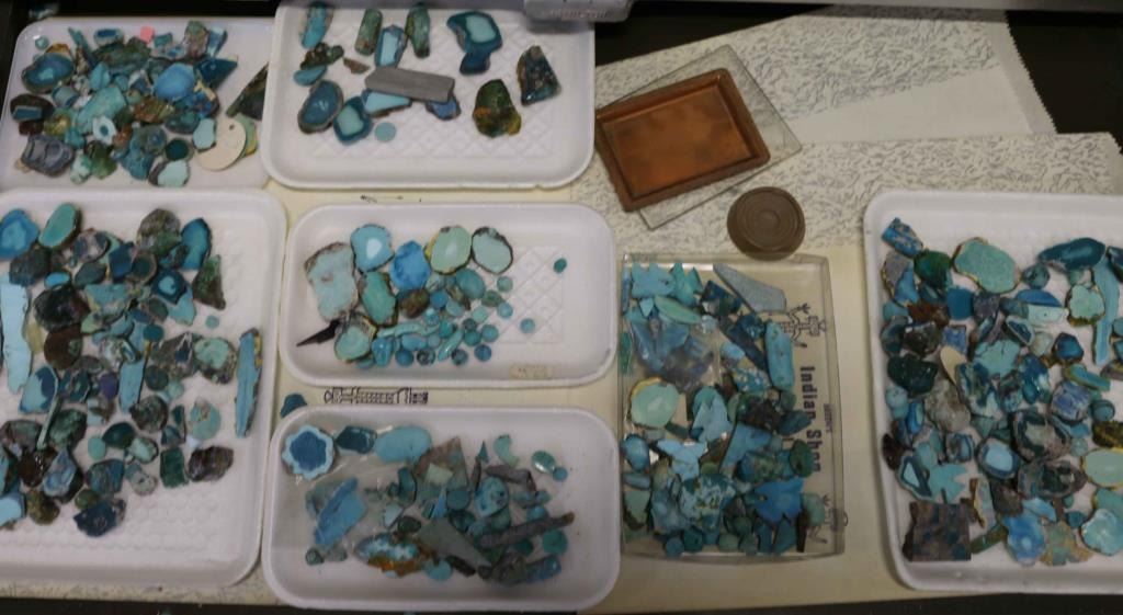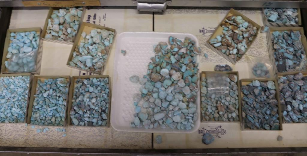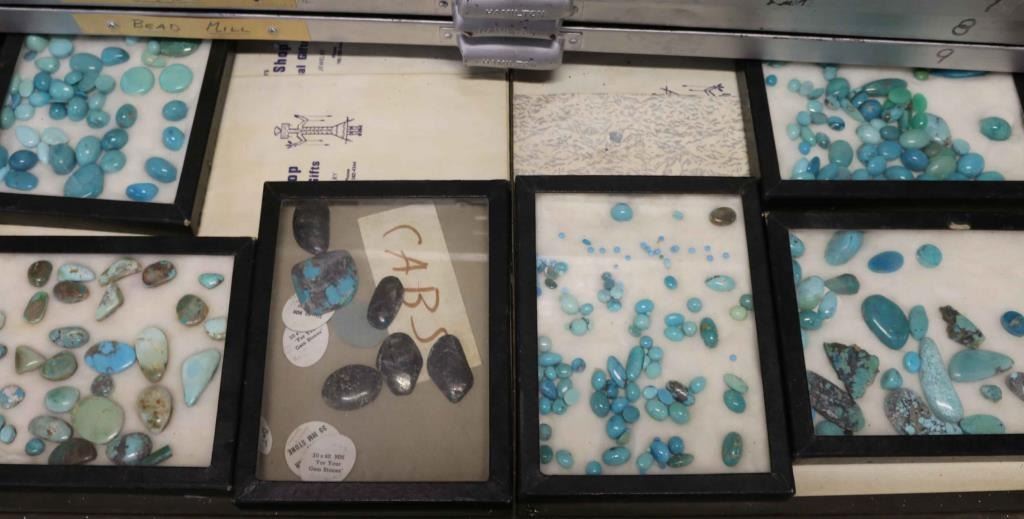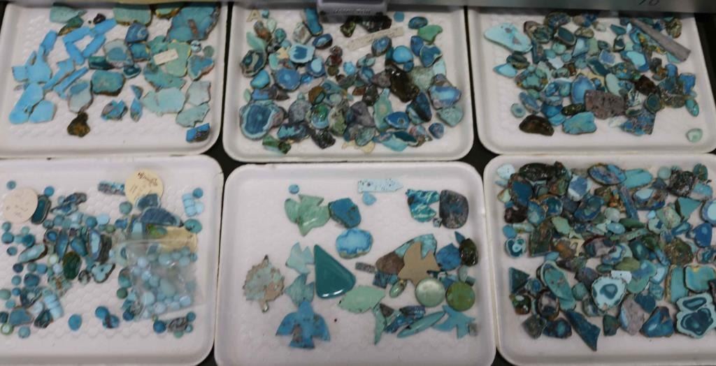in cabinet with 30 drawers, cut turquoise, natural nuggets, jewelry making equipment chains, clasps, bolo strips, belts, etc. Comes with the cabinet.