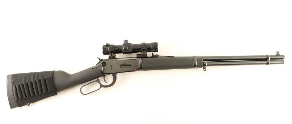 Lever action rifle.98% Blued finish, with dark gray polymer stock and forearm. 19" barrel. Swivel studs attached. mounted with a Tasco Accu dot scope, and hammer extension. Nylon cartridge holder on stock. Bore is excellent, and the action is tight and smooth. A couple of minor scratches on stock. NRA condition-very good. Modern Firearm.