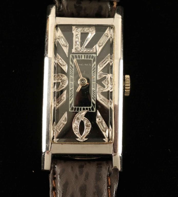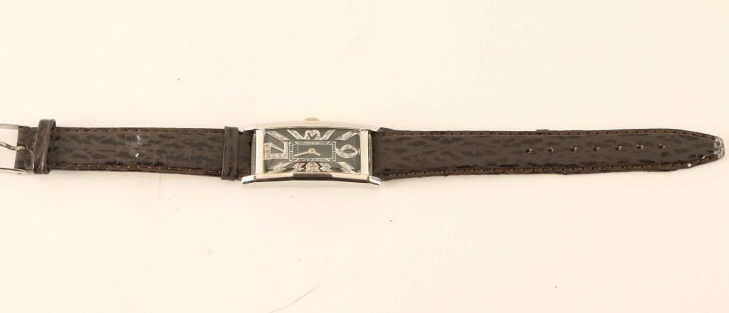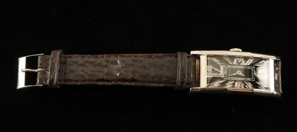with curved case with fancy dial, recently cleaned in running condition with fresh strap. From the personal collection of Rocky Newton collector and dealer in fine time pieces for 50 years. Now retired his inventory, price was 3600 and he states that he never saw another like it in platinum with fancy dial and curved case.