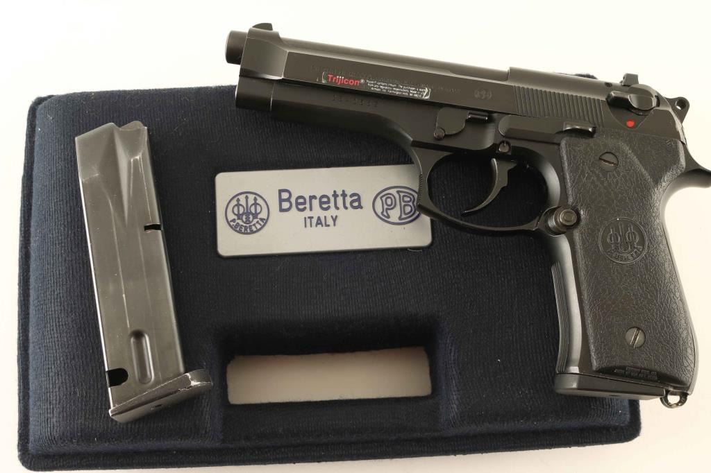 Italian made double action semi-automatic pistol chambered in 9x19mm. Imported by Berben Corp NY, NY. Features a matte black coated finish on the slide, 5" barrel, fixed blade front sight with white dot, dovetailed square notch rear sight with two dots, smooth trigger, serrated round hammer spur, ambidextrous manual safety/decocker on the slide, push button magazine release, 2 factory magazines, Factory box matte black finished alloy frame, serrated grip straps & integral lanyard loop on the butt and two-piece checkered black synthetic grips with Beretta insignias. Pistol exhibits approximately 97% of it's original finish showing edge wear and small scattered dings and losses. Action is smooth, bore is excellent and the synthetic grips are fine. Condition is NRA Very Good+++.