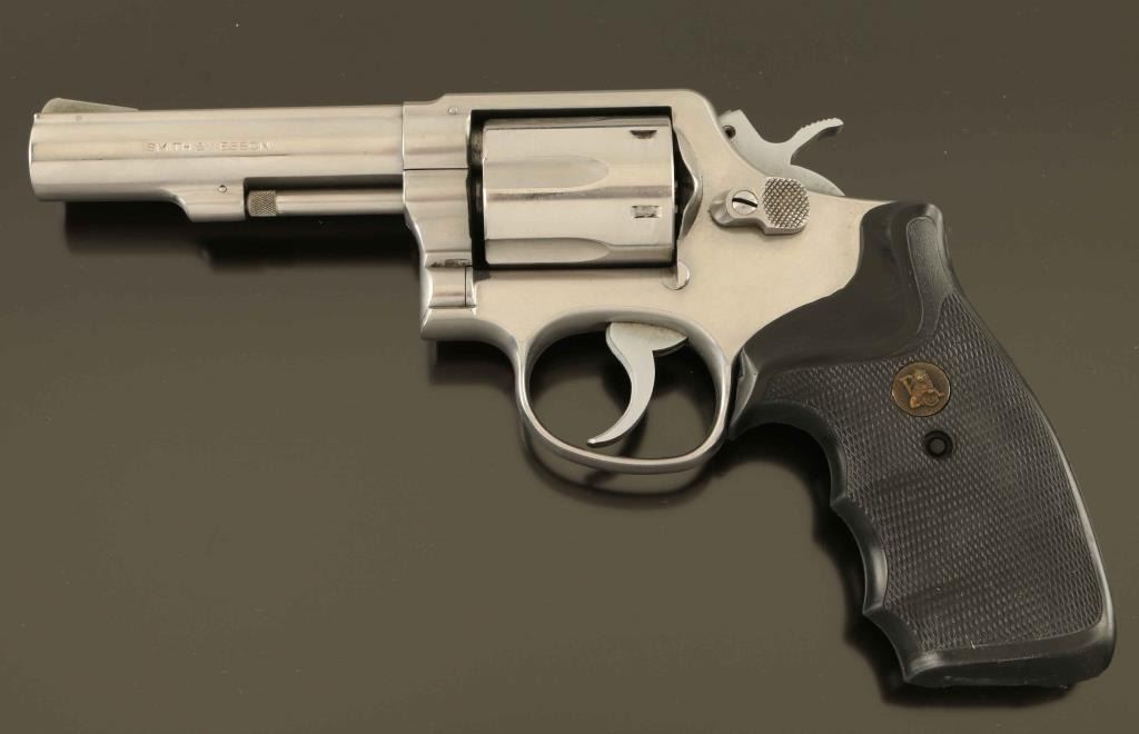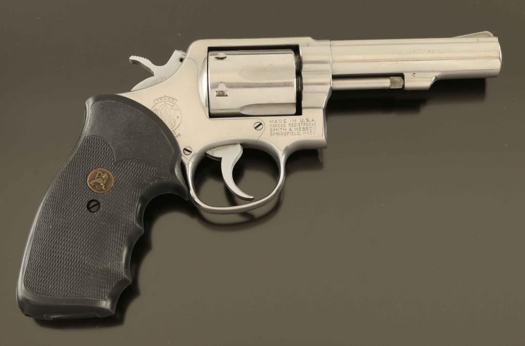 '.357 Military & Police Heavy Barrel Stainless' Medium frame stainless steel double-action revolver chambered in .357 Magnum, manufactured circa 1977-1982. Features a brushed finish, pinned 4" heavy barrel with matted sighting rib, non-shrouded ejector rod, serrated ramp front sight, square notch rear sight, fluted six-shot cylinder with counterbored chambers, serrated .265" service trigger, .265" service hammer, three screw square butt K service frame and one-piece Pachmayr Gripper checkered black rubber wrap-around finger groove grip. Revolver exhibits moderate holster wear and scattered handling marks. Action is strong with very good lock-up, the bore is excellent, and the rubber grips are very good. Condition is NRA Good to Very Good. ***Modern Firearm***