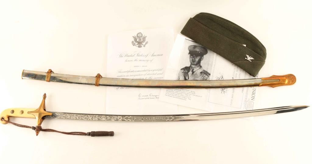 Owned by Donald Weiler Company Commander of B-1-3 in the Pacific Campaign and was awarded thr Silver Star. Includes copy of telegram from Lt Col George Van Orden and a copy of letter from President Reagan. Sword is etched United States Marines and measures 37" overall