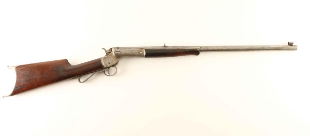 Antique break open single shot rifle chambered in .22 Long Rifle, manufactured circa 1870's-1895. Features a blued 24" part octagon barrel, globe front sight, dovetailed rear sight, removed tang sight, nickel plated iron frame, 'pistol grip' trigger guard, smooth trigger, knurled hammer spur, smooth walnut schnabel forend and straight grip shoulder stock with metal Swiss style buttplate. Matching serial numbers observed on the barrel, frame, triggerguard and forend. Rifle retains only traces of it's original finish with the majority of the metal surfaces displaying a light grey patina with some scattered rust tones. Action is sound, the bore shows light rifling & scattered pitting, markings are good and the wood stocks are fair with a major repair to the wrist. Condition is near NRA Good. ***Antique Firearm***