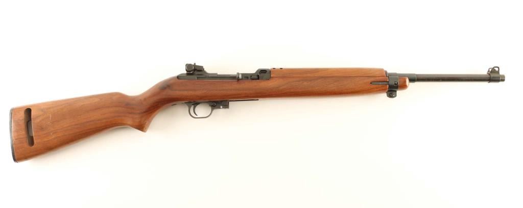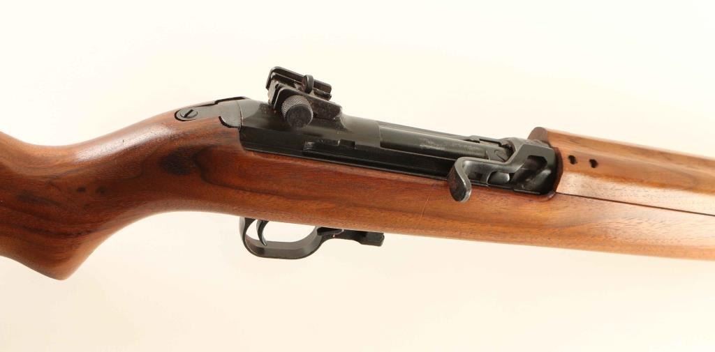 Commercial post-war production U.S. M1 Carbine pattern semi-automatic rifle chambered in .30 Carbine. Features a blued finish, 18" barrel, shrouded blade front sight, adjustable sliding aperture rear sight, smooth trigger, round bolt, rotary style safety, push button magazine release, no magazine, wide barrel band, four rivet wood handguard with wide groove, and smooth pistol grip stock with high wood forend & textured metal buttplate. Rifle retains approximately 40% of it's thinned blued finish with the balance comprised of brown patina and some light scattered rust. Action is smooth, the bore appears excellent but is dirty, and the wood stocks are near fine. Condition is near NRA Good. ***Modern Firearm***
