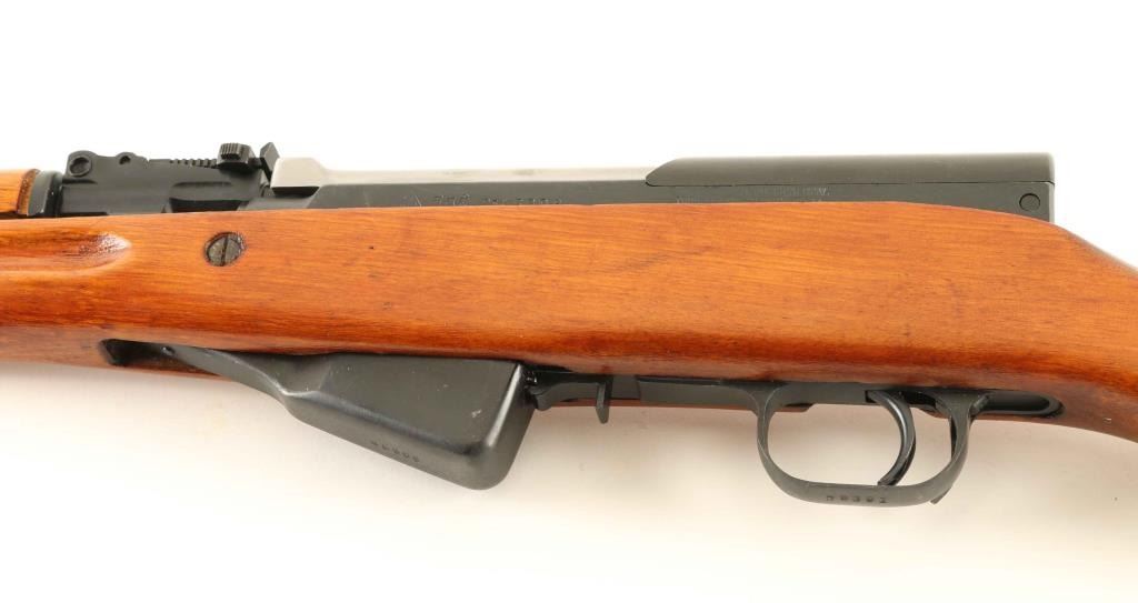 Semi-automatic rife. Chinese military rifle. 98% blued finish, with wood stock and handguard. 15 1/2" barrel, hooded front sight, and adjustable rear sights. Bore appears excellent/bright, but dirty. 10 rd Attached magazine. Missing the folding bayonet. Serial# matches on the bolt, receiver, receiver cover, and magazine. Mismatched on the triggerguard. Some minor scratches on the wood/metal. NRA condition-Very good. Modern firearm.