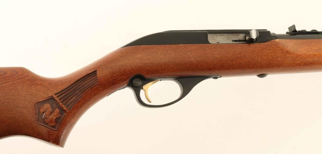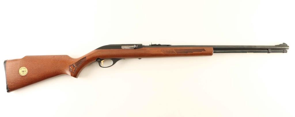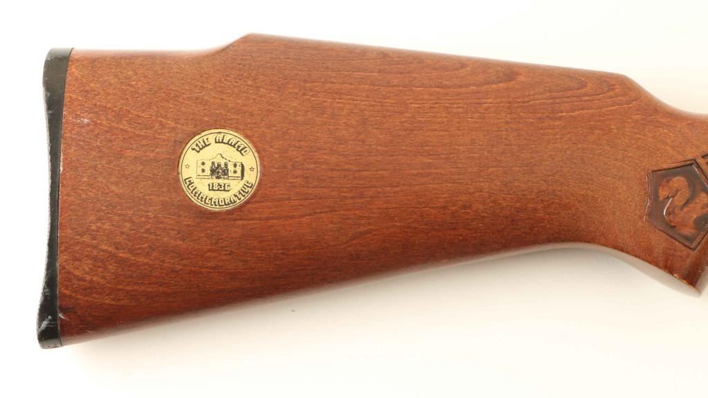 'Limited Edition, The Alamo Commemorative' American made tube fed semi-automatic sporting rifle chambered in .22 Long Rifle. Features a blued 22" "JM" marked barrel, ramped blade front sight, elevation adjustable rear sporting sight, integral scope rail cuts in the receiver, full-length tube magazine, smooth charging handle, gold plated serrated trigger, alloy trigger guard, push button safety, matte black finished alloy receiver and wood shoulder stock with textured forend & pistol grip, high comb, black checkered buttplate & commemorative stock disc. Rifle exhibits approximately 90% of it's original finish showing scattered losses and light surface rust on the barrel. Action is sound, the bore is excellent, and the wood stock is very good+. Condition is NRA Good+. ***Modern Firearm***