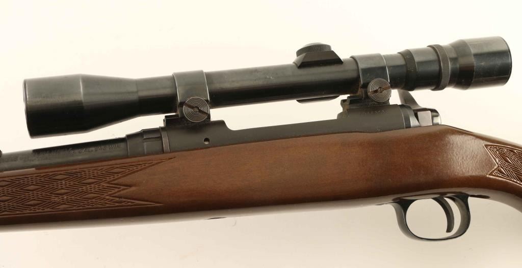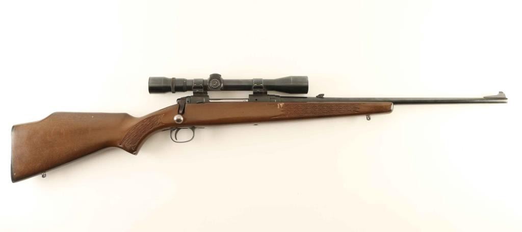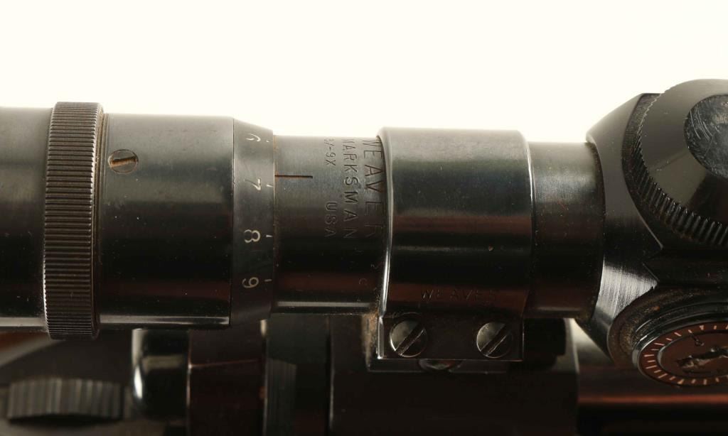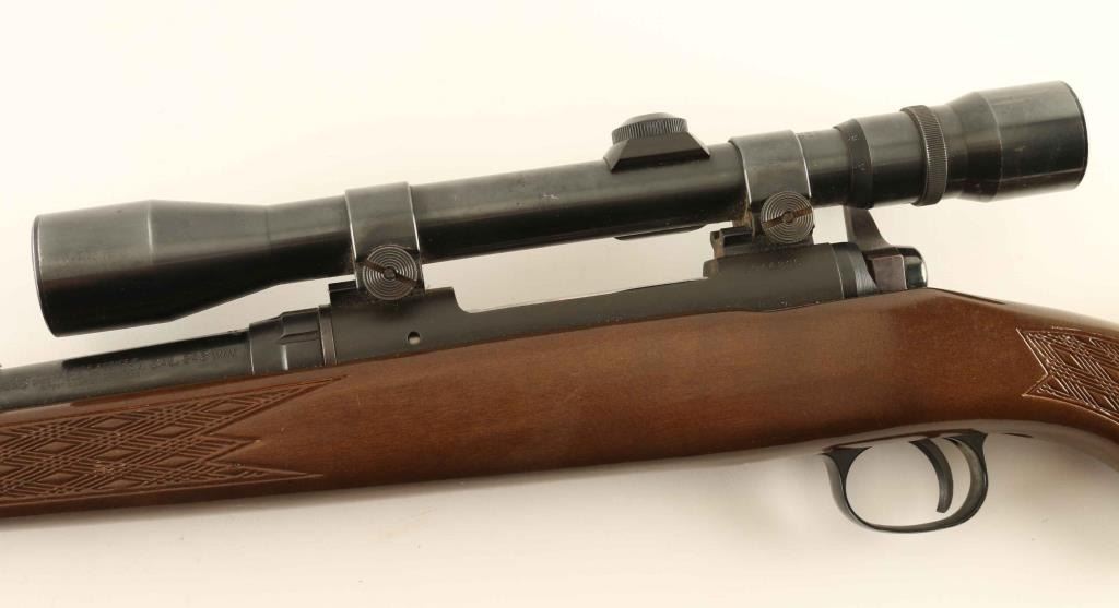 Rifle, bolt-action. 98% blued finish to the barrel. Matte-black receiver, chrome bolt, and black painted triggerguard. Brown finish to the bolt. 21" barrel, Bore appears very good, but a little dirty. Action is smooth tight, and bolt locks up tight. One-piece wood, checkered, pistol grip stock, with sling swivel studs. Mounted with a Weaver "Marksman" 3x-9X scope, with Weaver rings. Optics clear. Metal has some minor scratches. Wood stock has a few scratches/dents. A little cracking to the wood around the rear sling swivel stud. Not bad overall, but could use a good cleaning. NRA Condition-Very Good. Modern Firearm.