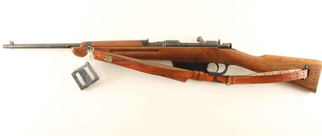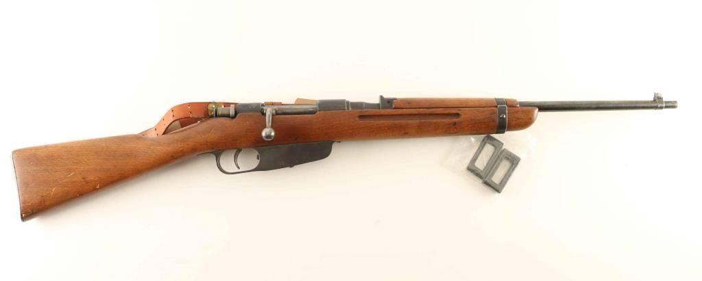 Bolt action rifle. Italian military. 80% blued finish, 22" barrel, with fixed sights. Bore appears excellent/bright. Action is tight. Serial# matches on the barrel, and stock. 6-rd box magazine. Some finish loss/scratches to the metal. Stock has been sporterized by cutting back the , and rounding the forearm. Comes with a newer brown leather sling, and two stripper clips. NRA Condition-Good/very good. Modern firearm.