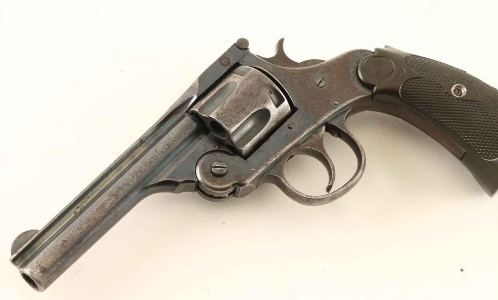 .38 S&W SN: 125874 'Second Model, Fifth Variation' Vintage top-break double action revolver manufactured circa 1897-1904. Blued finish, 4" ribbed barrel, round blade front sight, 'v' notched rear sight, fluted five-shot cylinder, smooth trigger, knurled hammer spur, round butt frame and two-piece checkered hard rubber square butt grips. Revolver exhibits approximately 50% of it's blued finish with the balance of the metal surfaces displaying a brown patina with pin prick pitting. Action is sound with good lock-up. the bore is bright with a couple spots of pitting and the hard rubber grips show a large chip in the backside of the left panel. Condition is NRA Good. ***C&R Firearm***