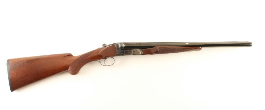 Shotgun, double-barrel, side by side. 85% blued finish to the barrels. Case-hardened etched receiver, lever, and triggerguard. Checkered, pistol grip stock, and forearm. Rubber recoil pad. 20" barrels. Bores appear excellent/bright. Action is tight. Barrels lock-up tight. Blued barrel has numerous scratches , and some rubs with loss of finish. Wood has numerous scratches. Not too bad. NRA Condition-Very good. Modern Firearm.