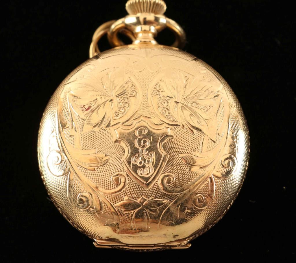 with 14K case by Dueber movement marked Diadem-Canton O-Ohio, crystal missing otherwise very good in running with clean missing.