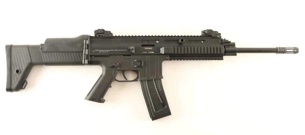 SN: A529957 German made semi automatic sporting rifle modeled after the FN SCAR, and chambered in .22 Long Rifle. Features a matte black 16.25" barrel with installed flash hider, quad-rail forend with full-length scope rail, flip-up sights, ambidextrous safety, ambidextrous magazine release, 22 round magazine, and black synthetic telescoping folding stock. Rifle shows only a few light handling marks with no major wear observed. Action is smooth, bore is excellent, and stocks are fine. Condition is NRA Excellent. ***Modern Firearm***
