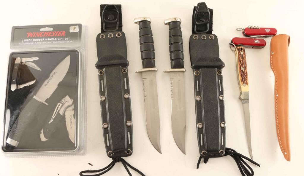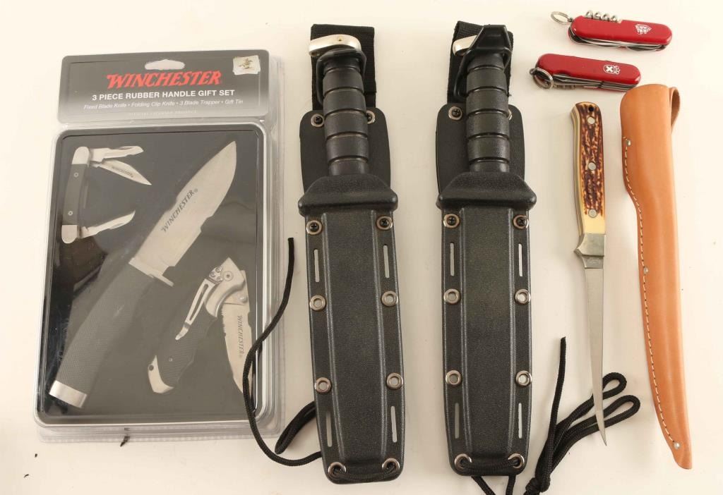 Including; Winchester (3) piece rubber handle gift set with one fixed blade and two folding knives, (2) Swiss Army type knives, Uncle Henry fillet knife in leather sheath, (2) hunting knives with rubber handles and composite sheaths.