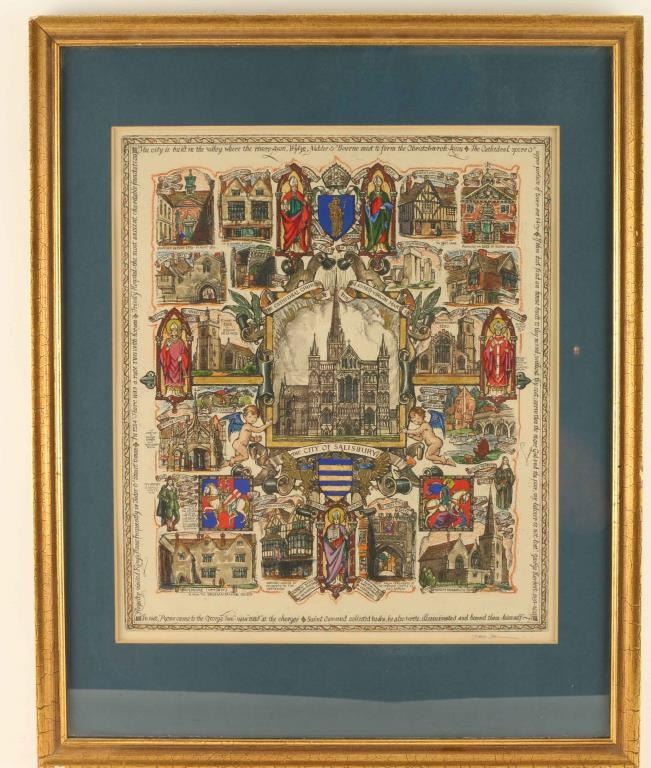 "Cathedral Church" depicting picturesque buildings, churches and points of interest in the city by Isabel Saul, signed lower right. Image measures 12"x14" in mat and gold crackle finish frame.