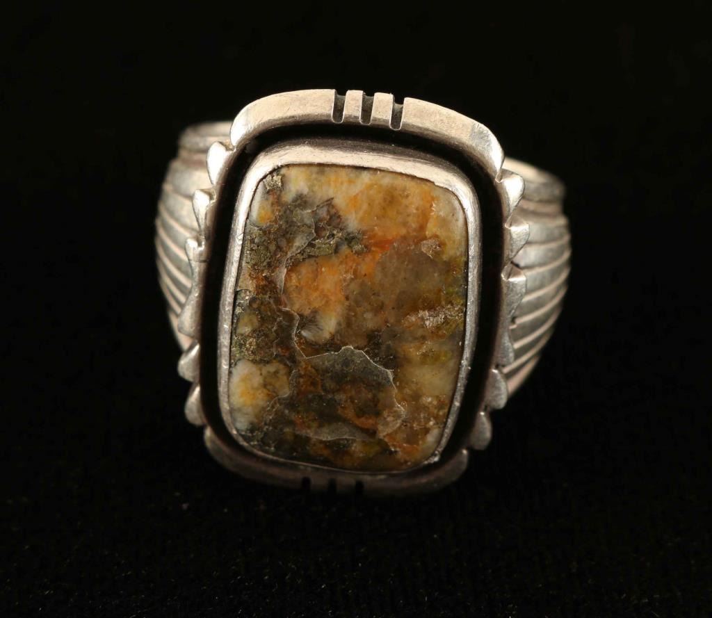 set in sterling and hand crafted by noted Navajo silversmith Will Denetdale with stone from the famous Stratton Mine in Arizona and named for its magnificent mixture of silver, gold, and quartz. The Stratton Mine is the only source of rare precious naturally occurring gem stone mixture, each piece having its own unique look.