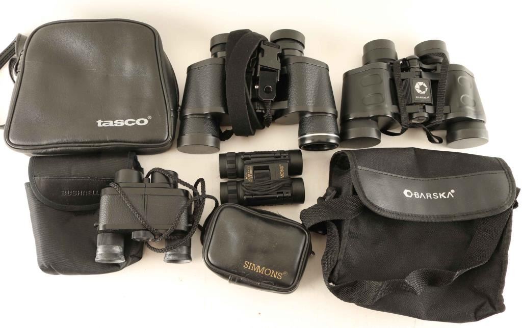 Including; Barska 7x35 WA, Tasco 7x35 Zip Focus, Bushnell Ensign 7x25, and a pair of Simmons Compact Mdl 1156 8x21. All in cases, good condition.