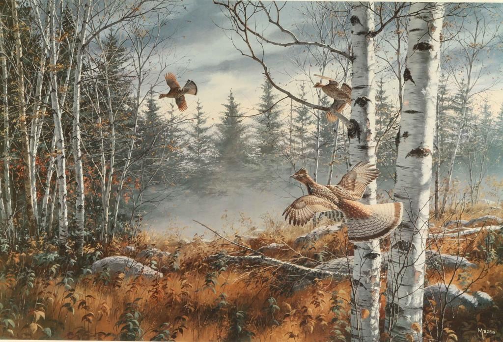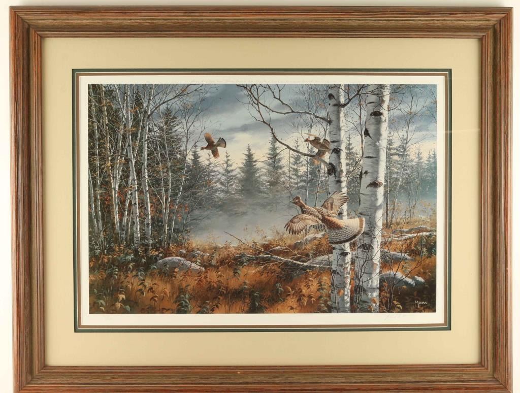 "Autumn Mist-Ruffed Grouse" by David A. Maas 177/850, hand signed lower right. Image measures 26"x17 3/4" in triple mat and wood frame. Includes artist's bio.