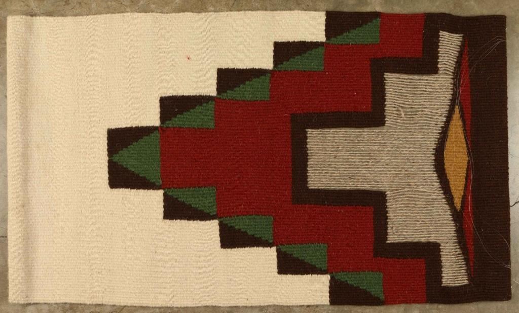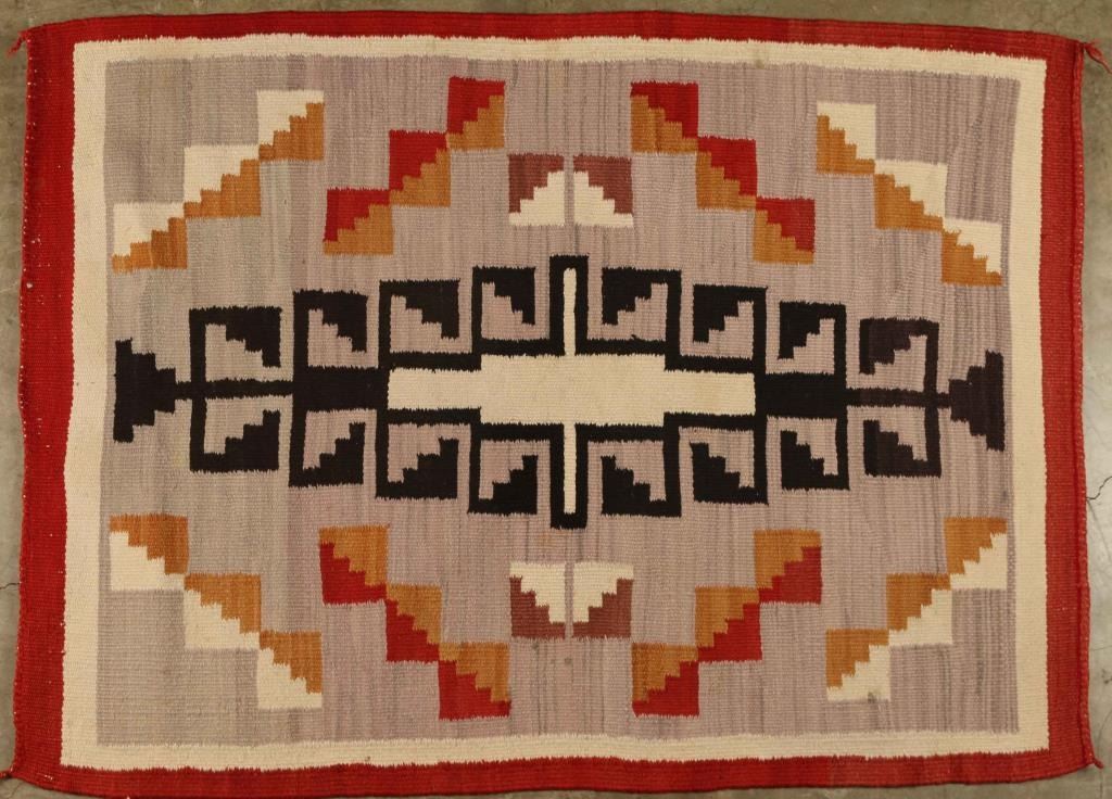 (1) Vintage Navajo Woven two gray hills rug, mid 29th century 42x30 (1)Vintage Navajo wool weaving rug with framed end meant for hanging , 1970's era 34.5x19.5