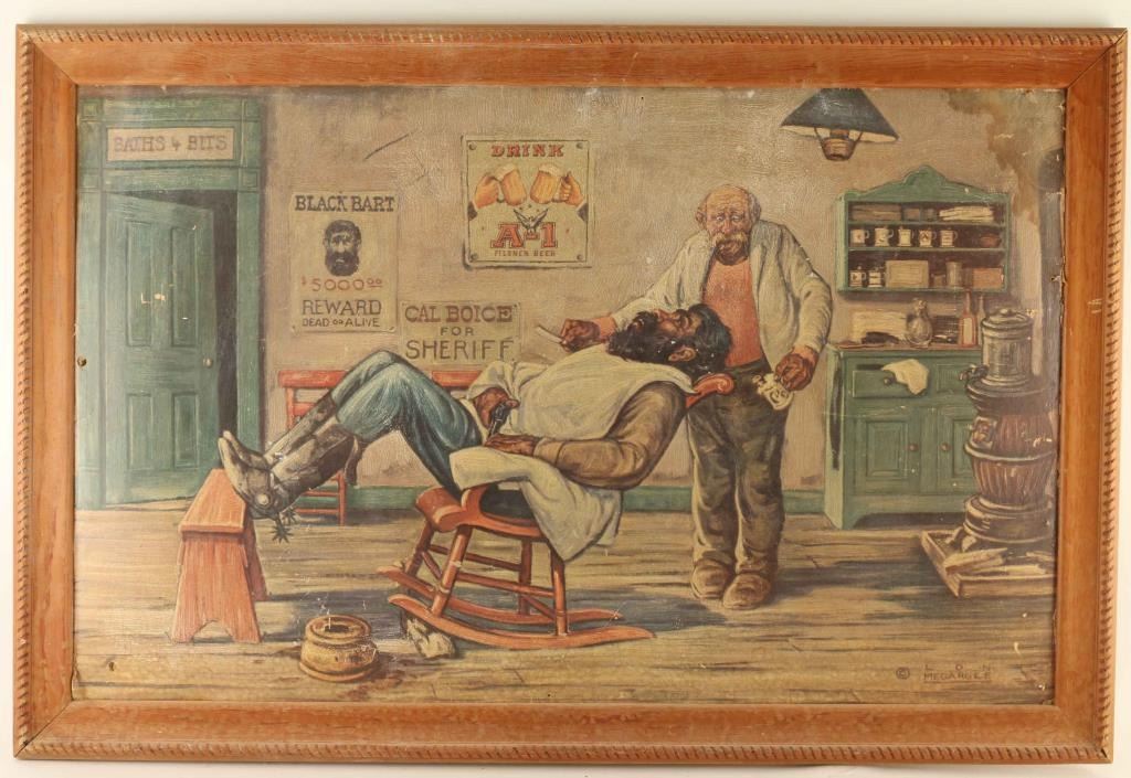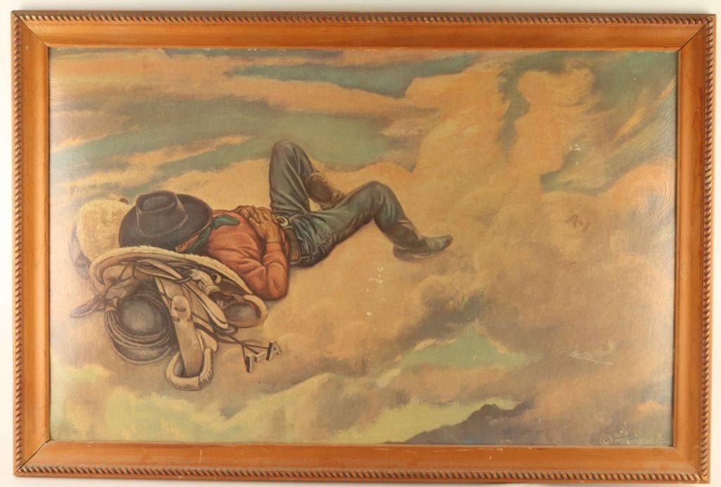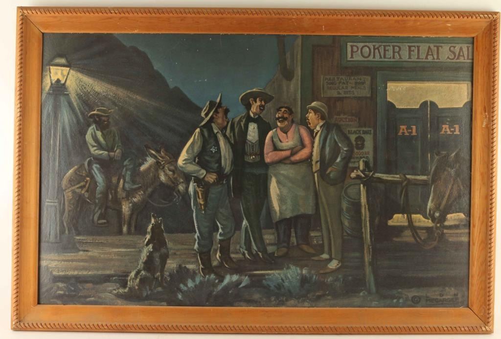 "Black Bart", "Cowboy's Dream" and "Poker Flat Saloon' in wood frames measure 21"x33". Show age and wear.