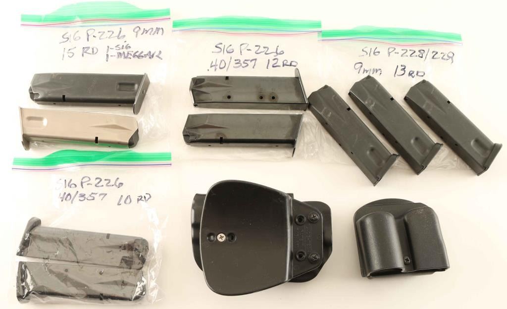 (2) Sig P-226 15rd one is factory (3) SIg P-228/229 9mm 13rd all factory(1) Holster (1) Mag Holder (2) SIG P-226 .40/357 12 rd Factory (2) SIG P-226 40/357 10rd factory mags