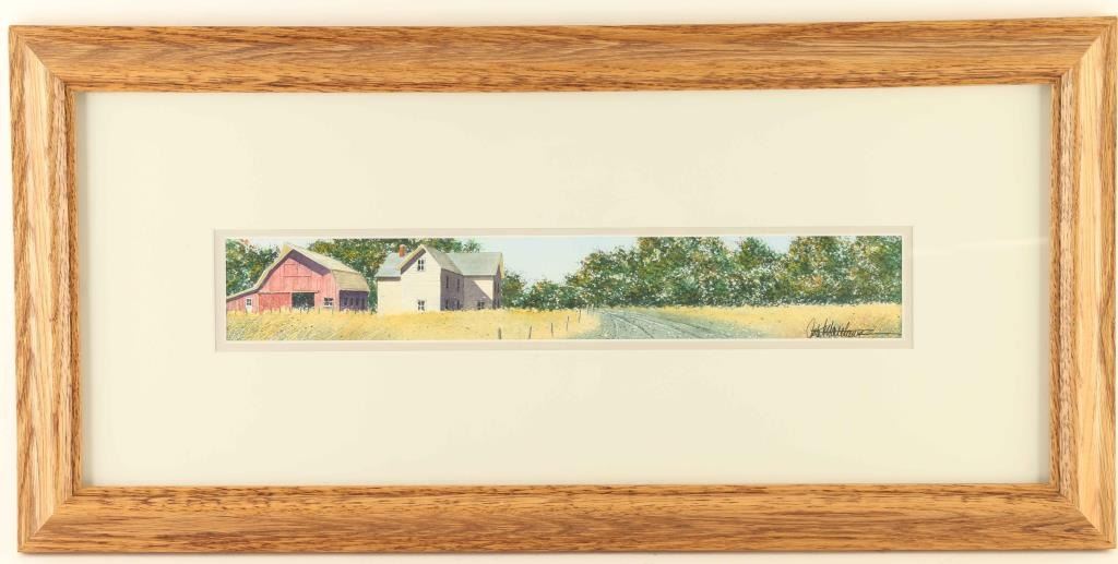"County Road" signed lower right. Image measures 2 1/2" x 16 3/8" in double mat and wood frame. Robert E. Matthews was born in Atlantic, Iowa and resides in Fort Collins, Colorado with his wife, Joyce. His interest in drawing started in his early childhood. Bob has known, since a young age, that he would be an artist. He received his bachelor's degree in Business Management, with a minor degree in Architectural Rendering, from Northwest Missouri State University. Bob has taken various watercolor workshops and several art courses at Colorado State University. He has been involved in many group shows, both juried and non-juried, as well as solo exhibitions. Bob is a versatile artist who is fascinated with the landscape and objects from the past, along with the interplay of light and shadow. His watercolor impressions capture the splendor and serenity of Colorado, the Southwest, and the Mid-west. "My understanding of painting has been developed through direct observation, the study of many other artist's work and time with a brush and some paint."