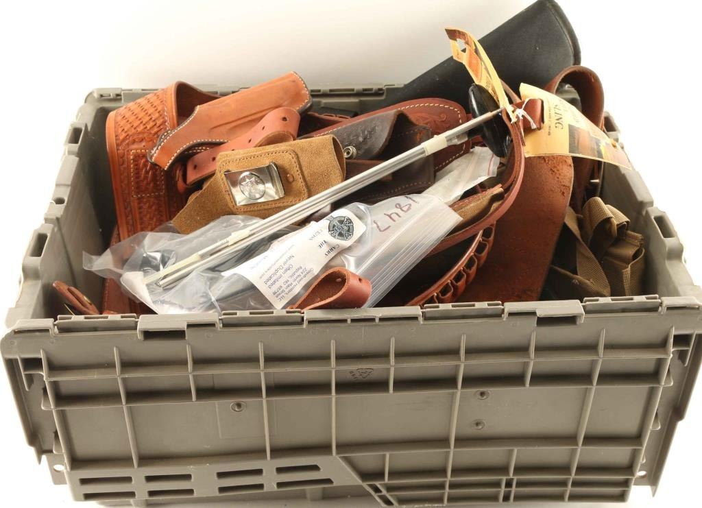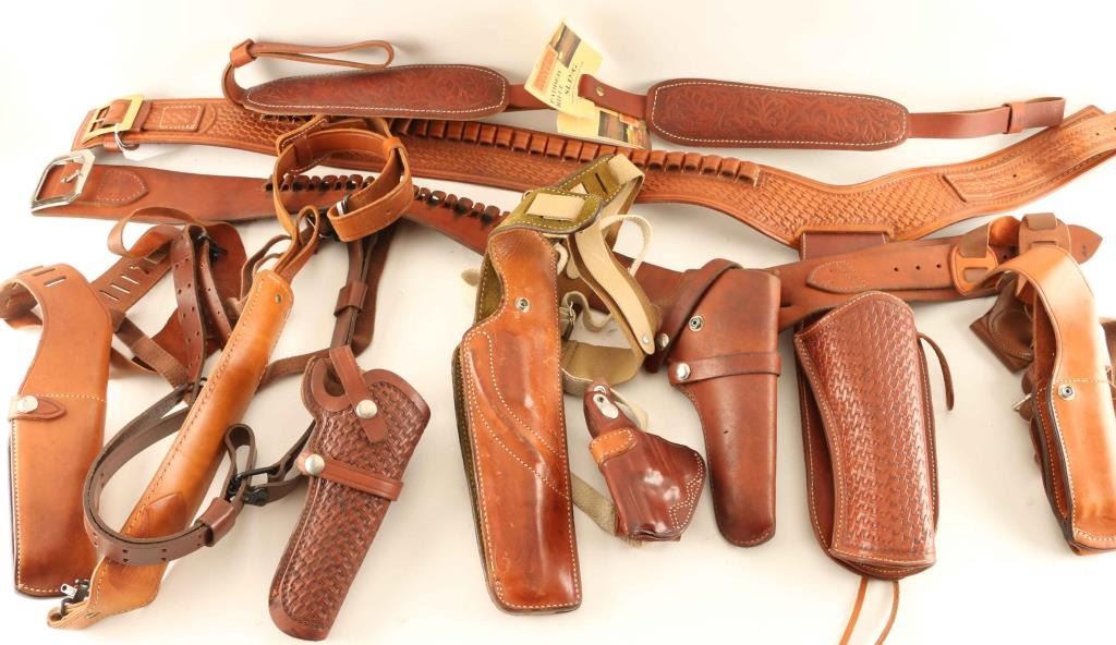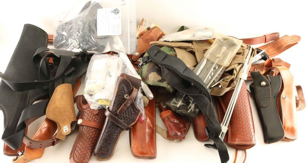 Including; saddle brown basketweave cartridge belt with holster size 40, smooth brown cartridge belt with holster size 36 shows use, Bianchi leather holster for .380A, black leather CrossBreed holster for S&W M&P, Uncle Mike's sidekick, basketweave Viking holster, magazine pouches, straps, cleaning rods and more.