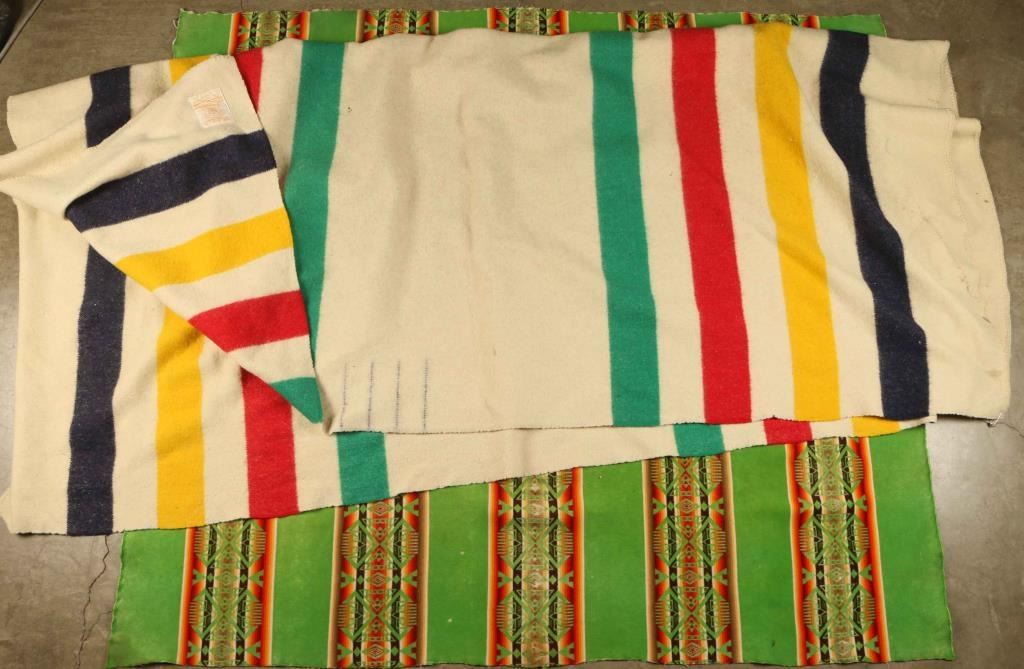 Green, red, yellow and navy stripes some yellowing and holes, "Hudson Bay Company Incorporated 1670" label intact. Made in England. Measures 7ft 3" x 6ft 4". Pendleton 'Beaver State' blanket in green with orange, brown, gold and tan geometric designs. Small holes, stains and fading 62"x55".