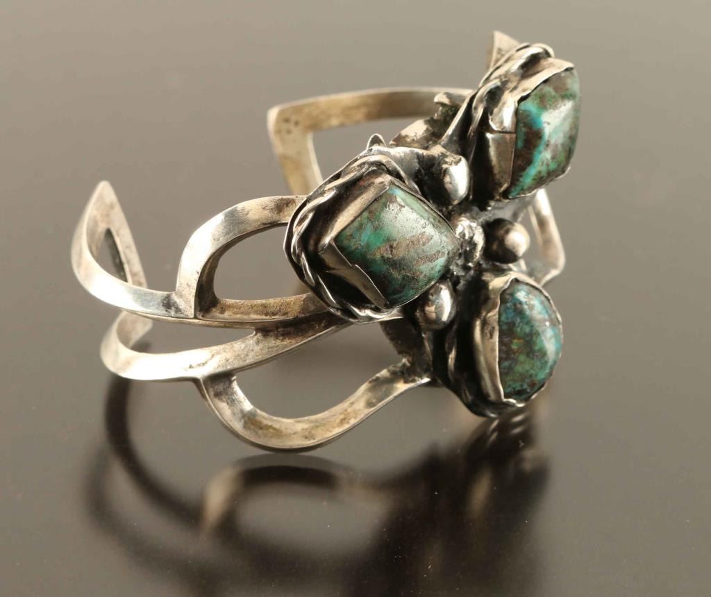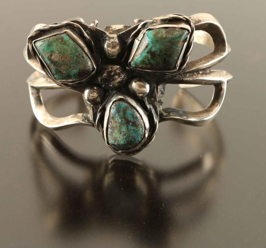 Openwork silver set with three turquoise stones with a bead design.