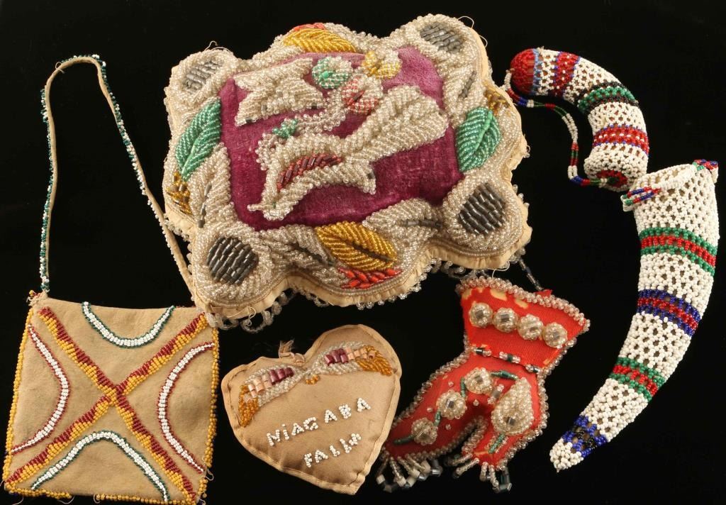Including; boot shaped whimsy with floral design on red cloth 5"x3 1/2", Crow 20th Century 6"x1 1/2" beaded horn, Arapaho 1910 4 1/2"x4" heart shaped whimsy reads 'Niagara Falls", Crow large beaded horn 9"x2", antique beaded pillow 1890s on purple velvet with bird design 10"x9"-losses to beadwork, and a vintage Plains Indian beaded leather purse, 20th century-also has losses to beadwork 5"x7".