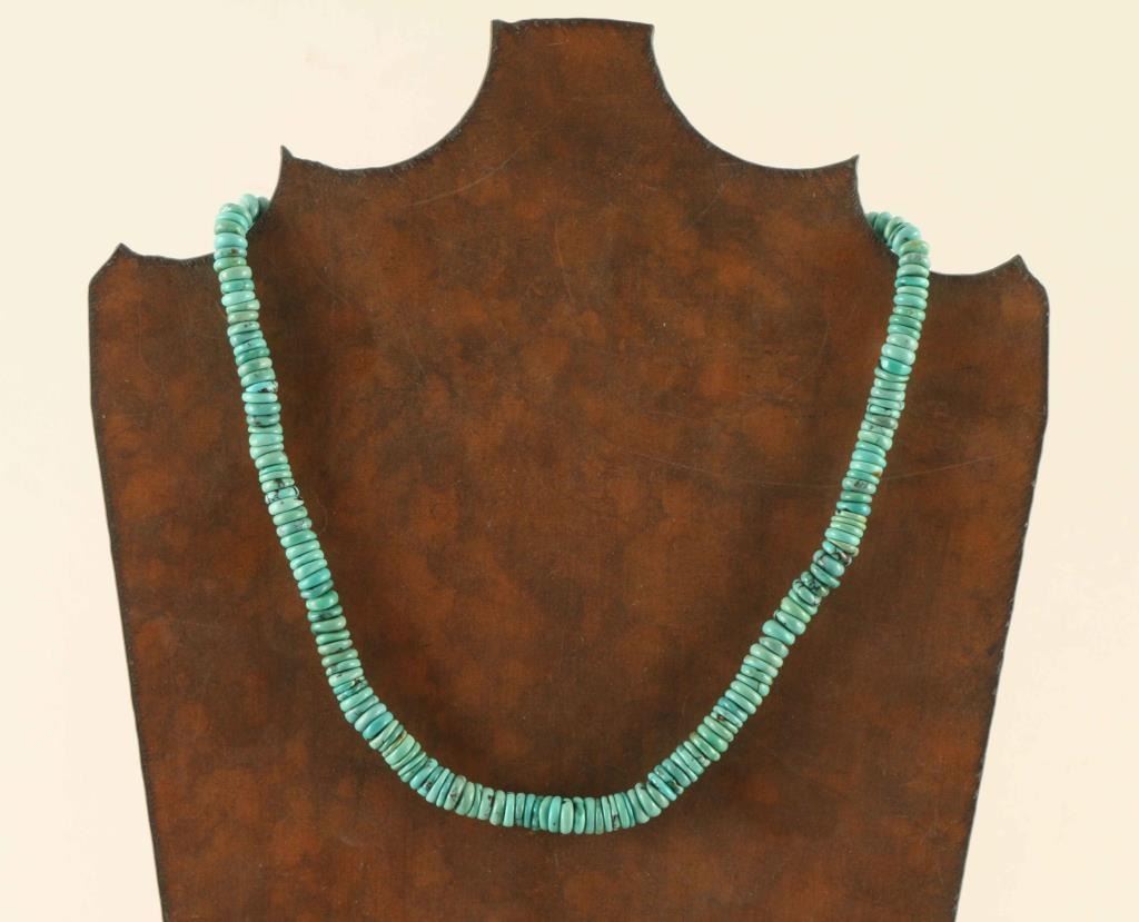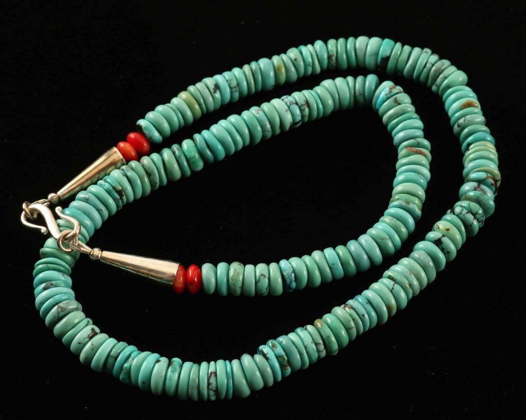 Beautiful shades of blue green, green and robin's egg blue with earth toned matrix. Coral and silver cone ends. Measures 18" long.