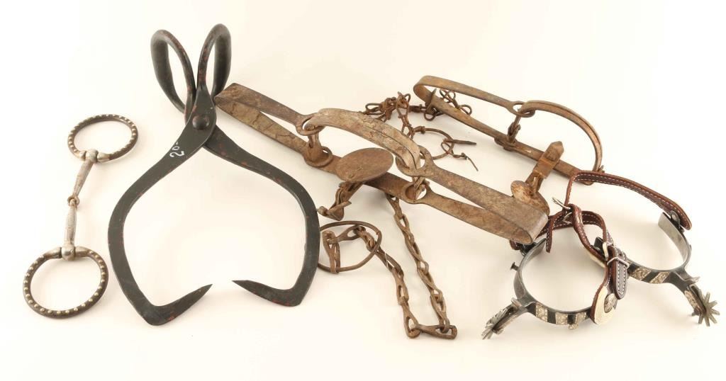 Including; (2) small animal traps, pair of silver overlay spurs, bit, and a pair of ice tongs.