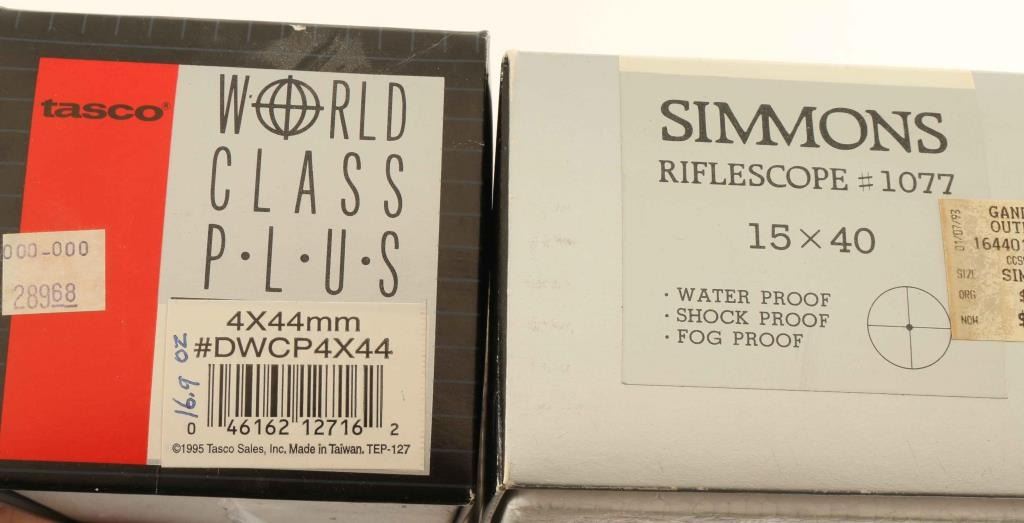 Simmons Riflescope 1077 15x40 waterproof, Tasco World Class Plus 4x44mm, and a Swift 1x20 shotgun scope Mdl 666M. All like new in original boxes.