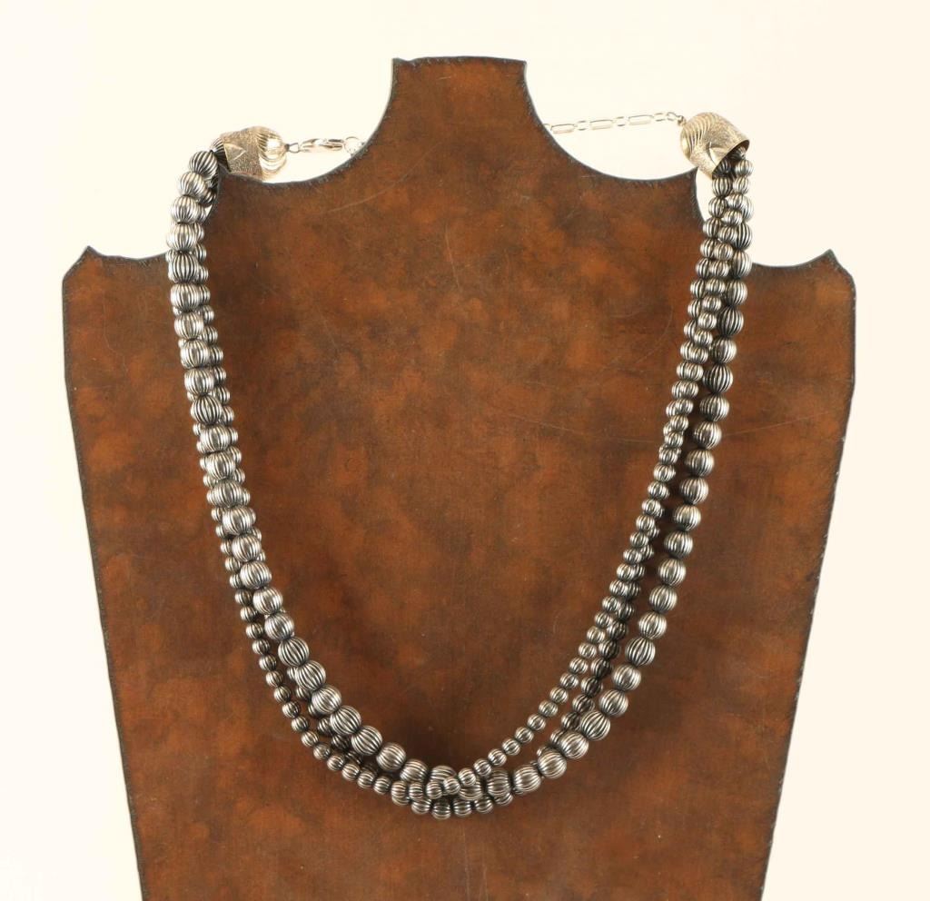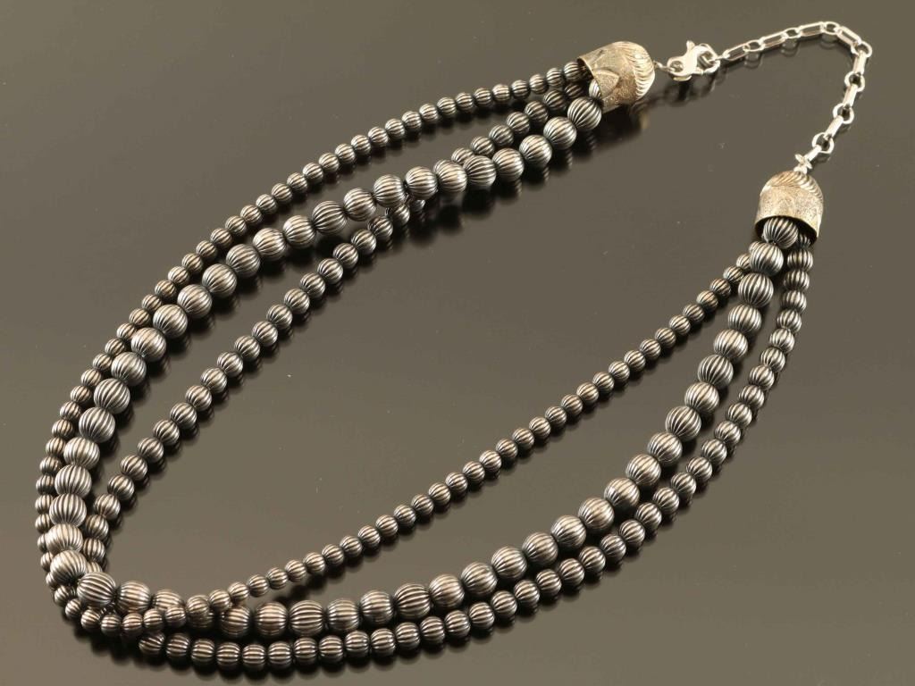 Three strand sterling silver bench bead necklace with an antiqued finish.